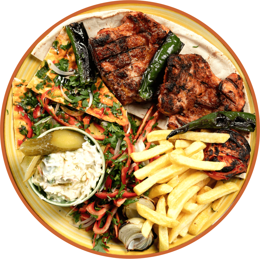 CARNE DE OAIE – 250g, GARNITURA GRILL – 25g (lipie, rosie coapta, ceapa coapta, patrunjel, ardei kapia), CARTOFI PRAJITI – 20g, PASTA DE ARDEI, PIPER, SARE