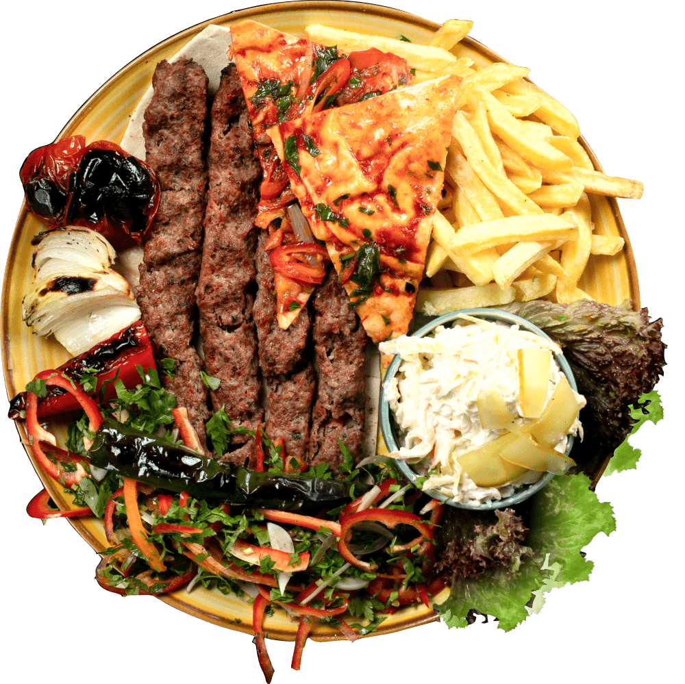 AMESTEC CARNE TOCATA-250g (VITEL 125g + OAIE 125g), GARNITURA GRILL -25g (lipie, rosie coapta, ceapa coapta, patrunjel, ardei kapia), CARTOFI PRAJITI – 20 g, CEAPA, ARDEI GRAS ROSU, PATRUNJEL, SARE