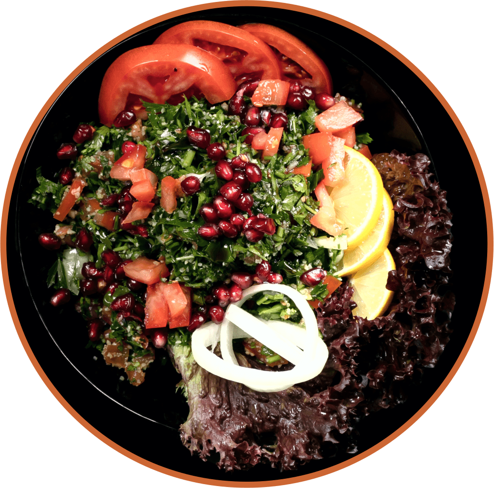 PATRUNJEL – 125g, CEAPA – 35g, ROSII – 20g, SEMINTE DE RODIE – 20g, BURGUR, ULEI VIRGIN  DE MASLINE, SUC DE LAMAIE, SARE